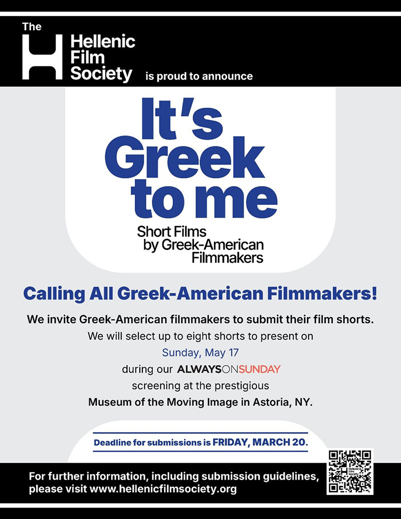 Astoria, NY – January 20, 2026 – The Hellenic Film Society (HFS) is currently accepting film submissions from Greek-American filmmakers for its second annual It’s Greek to Me! short film program. Up to eight films will be selected by an independent panel of judges and shown at a special screening of the Society’s Always on Sunday Monthly Greek Film Series at the Museum of the Moving Image (MoMI) on May 17. The program is open to Greek-American filmmakers. Deadline for submissions is March 20. Films in English are eligible, as are films in any language if they have English subtitles. Additional details, including submission guidelines, can be found on the HFS website, www.hellenicfilmusa.org.